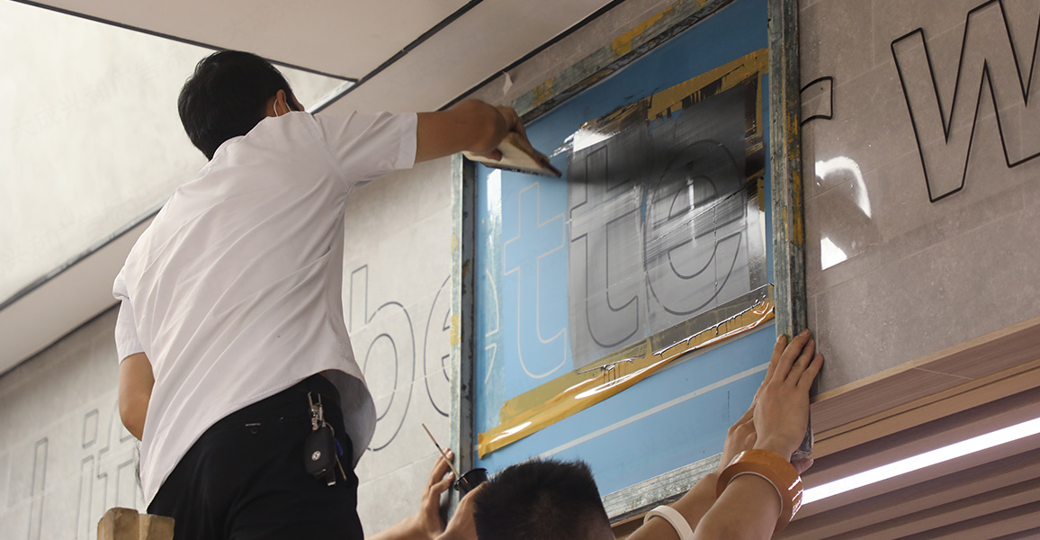 本工厂可提供墙面丝印(墙体丝印/现场丝网印刷)上门丝印服务(仅限深圳及其周边地区),以下照片是本厂为其中一家餐厅提供墙面丝印上门服务的现场制作实例。